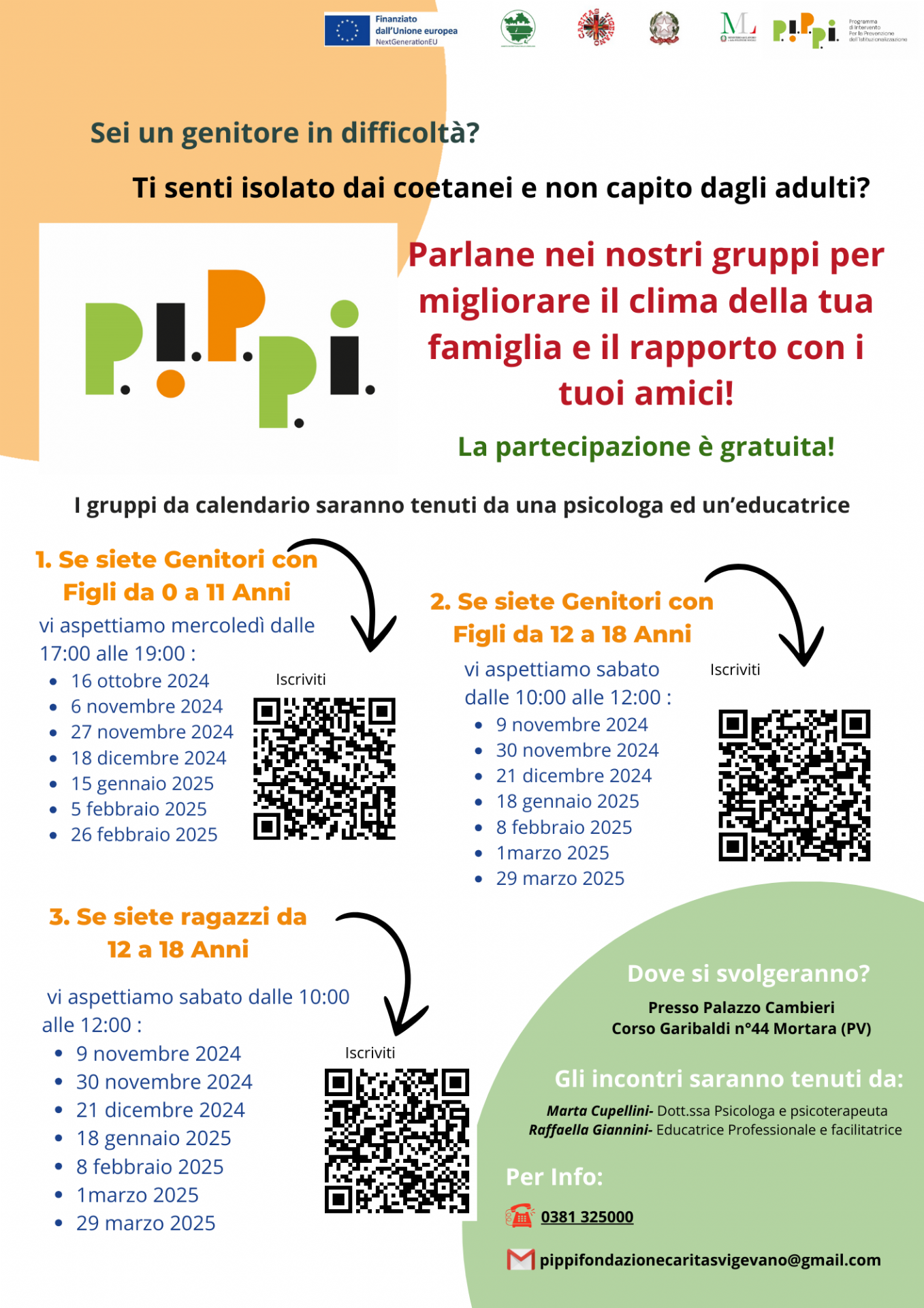 Sono aperti a tutti i genitori, suddivisi per fasce d’età, e offrono risorse pratiche sulle sfide quotidiane della genitorialità.